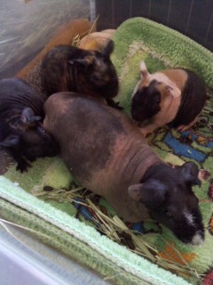 | 【東京都 Hさん スキニーギニアピッグ 女の子】 3匹のスキニーギニアピッグをご購入いただきました。 先住スキニーと4匹家族になりましたが、さらにベビーも4匹生まれたということで、 8匹の大家族になったそうです! とてもにぎやかでしょうね! 赤ちゃんも順調にそだって、みんな仲良く元気にすごしているとのことです♪ |